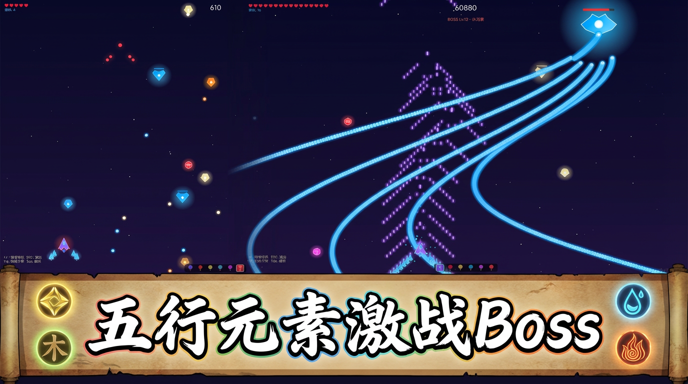 五行元素主题的经典打飞机游戏!支持街机模式和自由模式,拥有多种子弹类型(激光、散弹、电磁炮、追踪弹、爆炸弹)、Boss战、僚机系统、护盾系统等丰富玩法。街机模式挑战排行榜,自由模式随心切换武器!
