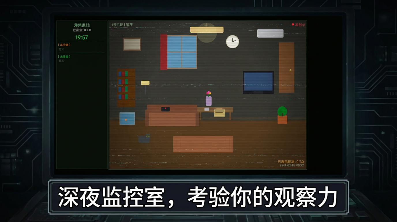 你是一名深夜安保监控员,负责通过监控画面发现房间里的各种异常现象。在20分钟内找出全部30个异常即可过关!异常会随机出现在客厅的19件物品上,注意观察每一处细微变化。考验你的观察力和反应速度!