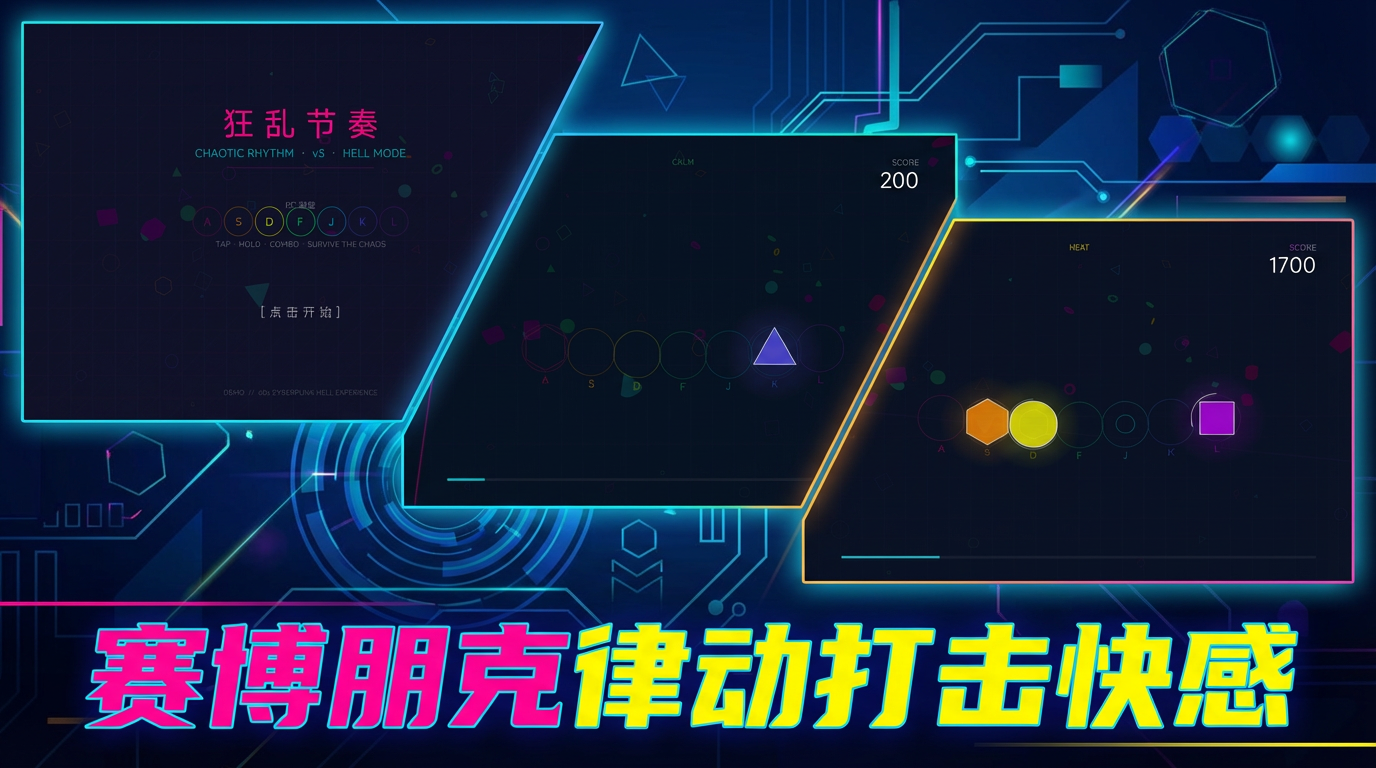 赛博朋克风格极限节奏街机游戏,7槽位律动打击,支持点按、长按、连击堆叠三种玩法。闪电地狱、几何爆发、声光震动,60秒内挑战你的反应极限!