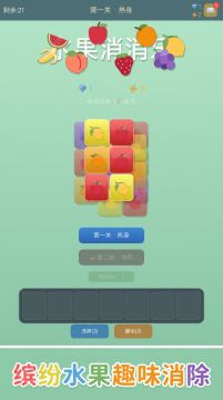 水果方块消除是一款益智类游戏,玩家可以通过左右移动水果方块,形成一排达到消除的目的。