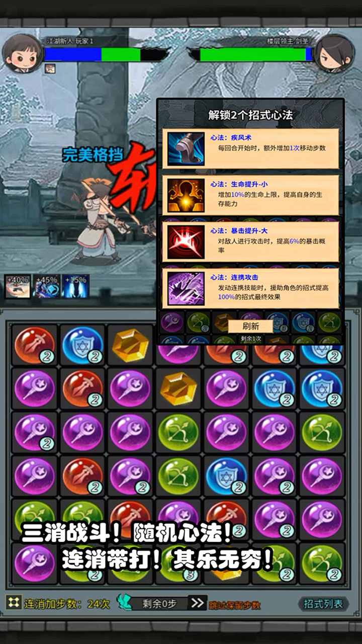 招式技能,自由搭配!三消战斗,无限闯关!