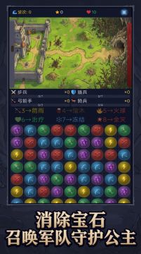 哥布林大军来袭,公主危在旦夕!通过消除宝石召唤步兵、盾兵、弓箭手和骑兵,在战场上排兵布阵抵御敌军。连击combo还能释放箭雨、滚木、火球等强力技能,用智慧守护王国与公主!