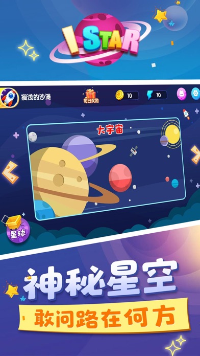 《I Star》是一款经典流行的休闲小游戏。探索星空,开辟新的家园!【玩法介绍】1.每一关都有一个目标,达成目标进入下一个更广阔的世界2.在适当的时候点击屏幕释放爪子掠夺各种星球即可获取分数3.各种道具,更多欢乐4.探索深邃星空的无限可能