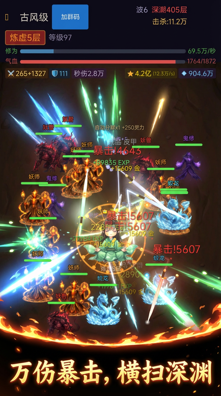 飞剑万伤暴击,横扫深渊603层BOSS!突破炼虚境界,群剑齐发斩尽妖师蛟龙,波次围攻战斗炸裂。收集神剑升级职业,挂机离线自动修炼,秒伤破万不是梦,开启你的肝帝修仙之路!