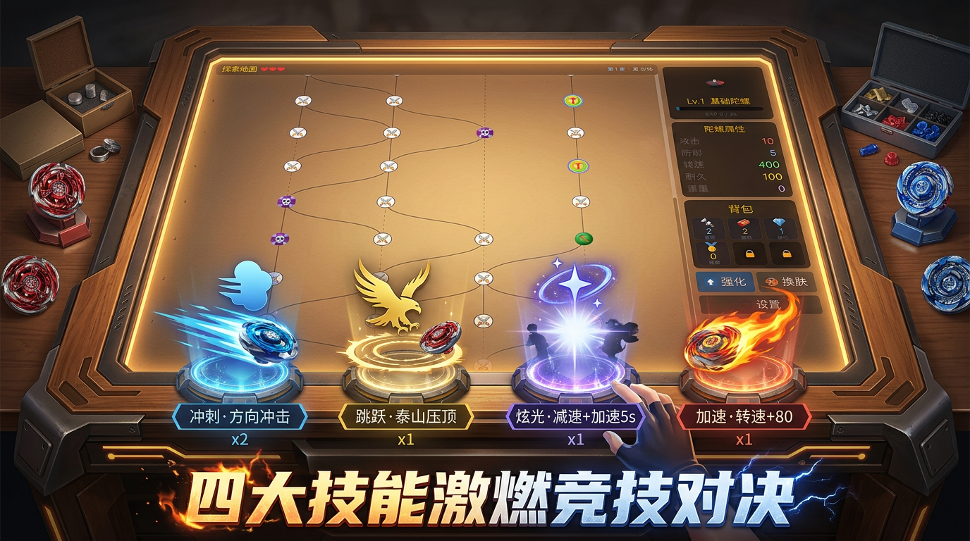 操控专属陀螺在竞技场中激烈对决!释放冲刺、跳跃、炫光、加速四大战斗技能击退对手,探索Roguelike随机地图收集金属、塑料与核心材料,强化攻击、防御、转速等属性,解锁炫酷皮肤,称霸陀螺竞技场!