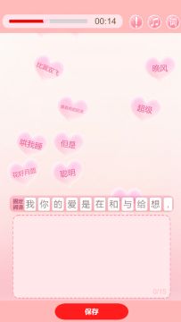 通过点击掉落的词语,来随机组成专属于自己的情诗1.在30秒内选取心仪词语2.可无限使用固定词语3.选中卡片可以和另一卡片切换位置,点删除按钮可删除词语4. 点击下方保存按钮保存情诗