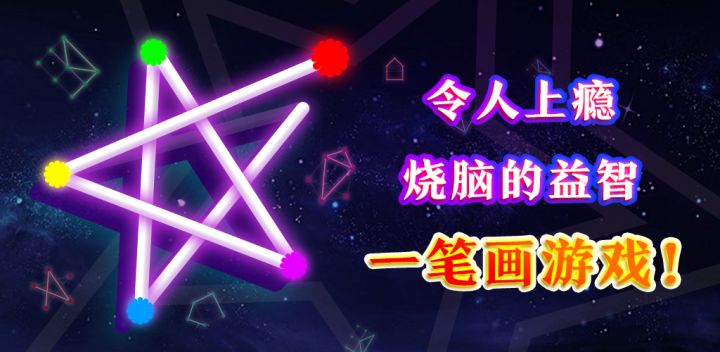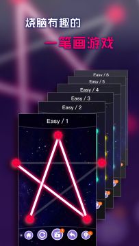 一款烧脑而令人上瘾的一笔画智力游戏。色彩绚丽的线条,轻松的音乐,清新的界面。一笔连接所有的点,画出完整图形。赶快来测试你的脑力吧!玩法简单但是很吸引人。游戏规则:首先选择一个点作为起点,然后连接所有圆点,一笔画出完整几何图形,经过一次的线不能再次经过,划过的线条不可重复。还有比较重要的是你必须划完所有的灰色线条。两种模式,不同难度,每种模式有大量有趣而各异的几何图形关卡来挑战你的脑...