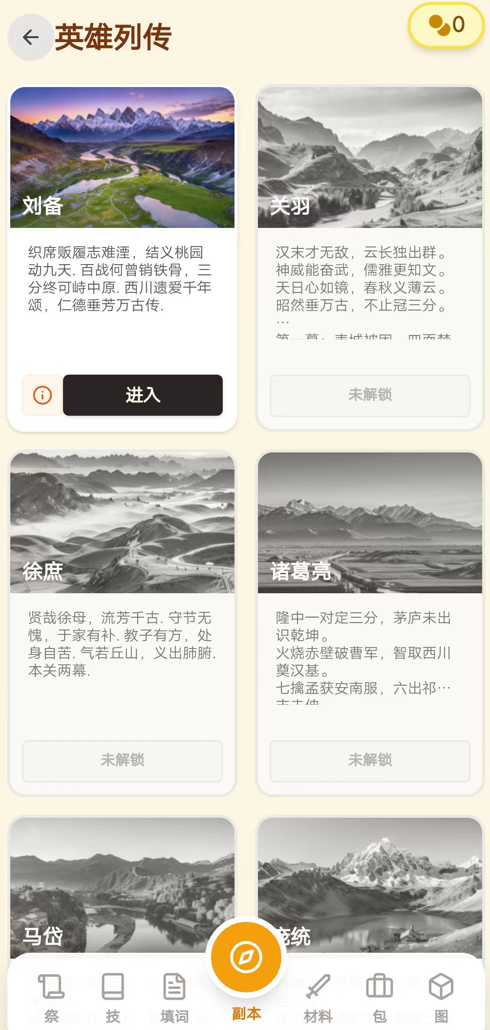 通过合成指定汉字来通关,有助于了解三国历史,同时开发智力,同时还有趣味小游戏劈材或者填词等,后期还有更多功能期待中……