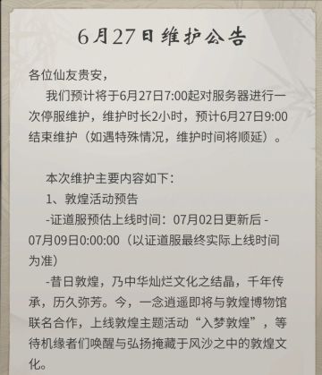 6月27日早晨07:00体验服更新公告