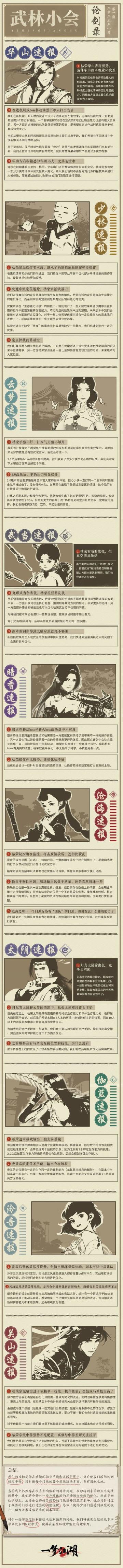 “武林小会·论剑录”第一期编汇完成! 十大门派少侠齐聚首,与天机阁弟子一起聊聊门派体验技能感受和操作体验!围绕着各大门派的副本表现、连招操作手感、技能设计实用度等等问题,进行了一番深入交流讨论。 三哥已经将会议内容整理成图文与少侠们分享,在即将到来的职业平衡性调整中,我们将会针对一些异常体验的反馈做出全面的优化。在后续的职业平衡和宗派扩展中,我们会努力使各门派间达到相对平衡,让每个门派的各个宗派玩