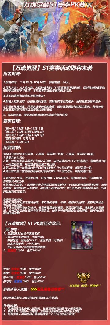 { "text": "【万魂觉醒】S1赛季 PK赛即将来袭!\n欢迎各位新老冒险家踊跃报名参与~\n报名方式加入玩家QQ群728676836;发送 游戏名称+‘S1赛事参赛’至群消息,同时保持游戏昵称在赛事结束前不可更改;\n赶紧来报名吧~", "raw_text": "" }