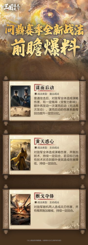 #三国谋定天下 #汉祚黄天 #三国SLG #策略游戏 问鼎赛季丨最新战法情报速递!来看哪些战法即将登场 各位主公好,本期问鼎赛季前瞻爆料栏目,乔妹为大家带来最新战法的详细信息! 以下为全新战法的详细信息▼