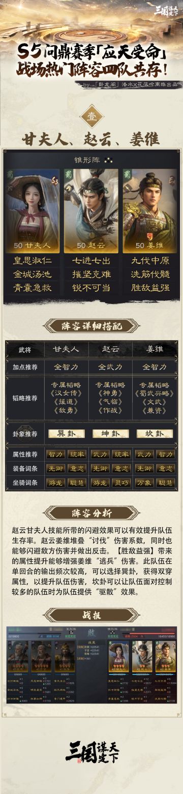 S5问鼎赛季丨战场热门阵容盘点第二期!近期战场热门阵容一览! 本期【卧龙阁】花落吟离殇为大家带来“S5问鼎赛季战场热门阵容推荐第二期”,每套阵容都附有韬略推荐、加点建议、阵容分析、及卦象组合推荐。让我们一起看看,当前战场的热门阵容都有哪些吧!