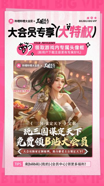 #三国谋定天下 福利活动 | 三谋X哔哩哔哩大会员活动来袭,定制福利等你来领! 新春佳节,万象更新!当波澜壮阔的三国世界碰上哔哩哔哩大会员的专属福利,会擦出怎样的火花?《三国:谋定天下》携手哔哩哔哩大会员,为你带来新春专属福利盛宴,快和乔妹一起来看看! 即日起,《三国:谋定天下》向回归主公发出诚挚邀约!1月23日至3月1日期间,无论您是暂别后重归战场,还是许久未登录的老友,回归后登录游戏,达成条