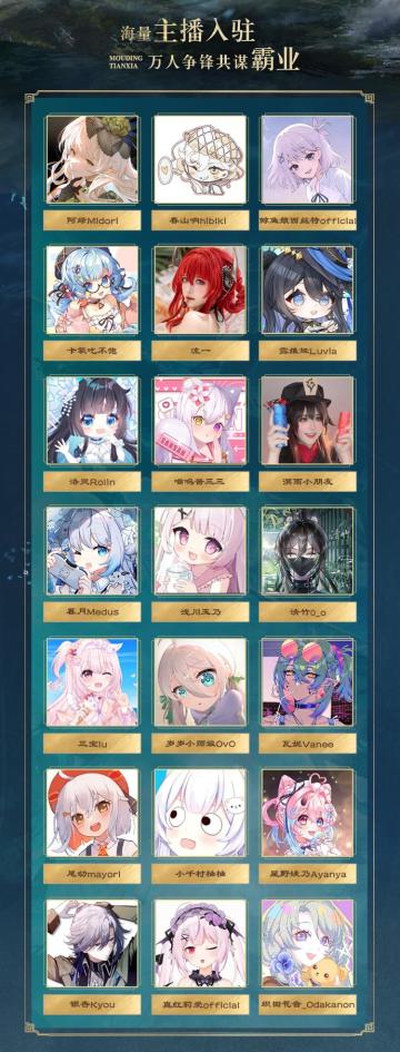 #跟着PDD刘谋一起三谋 #3月15日三谋招贤服 #三国谋定天下 群雄齐聚,共谋霸业!B站虚拟主播&UP主共战招贤主题服! 《三国:谋定天下》招贤主题服将于3月15日正式开启! 本次将有一众B站虚拟主播&UP主入驻招贤主题服,与诸位主公共谋霸业! ▼下面让我们一起来看ta们的完整名单!