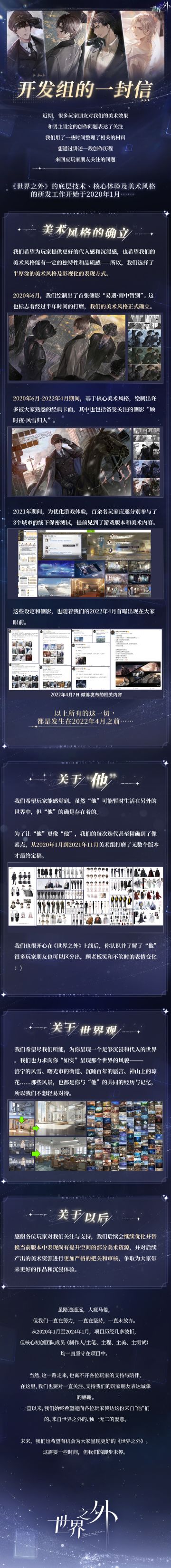 各位玩家朋友好, 为提供更好的沉浸体验,让每一位玩家朋友都能相信“他与你们的故事都确实存在于世界之外的世界”,《世界之外》在研发之初,便与每一位合作伙伴和工作人员都签署了正式的保密协议。 与男主相关的所有幕后工作人员,无论是美术、文案还是配音演员,每一位幕后工作人员在遵守保密协议的情况下,都不会走到台前让大家知道。我们感谢每一位幕后工作者的付出和支持,也相信他们会一直信守与《世界之外》的约定。 而