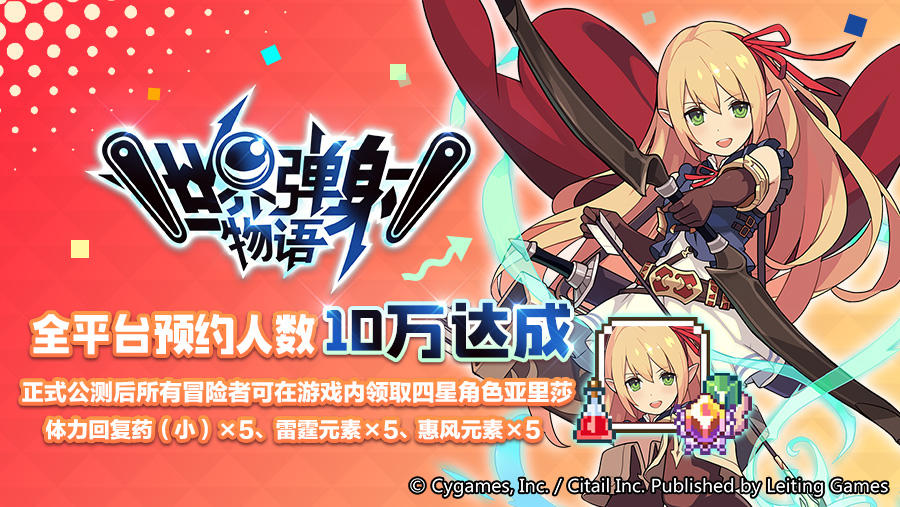 "text": "《世界弹射物语》全平台预约人数10万达成!感谢各位冒险者一直以来的耐心等待与支持!\n\n正式公测后所有冒险者可在游戏内领取四星角色亚里莎,体力回复药(小)*5、雷霆元素*5、惠风元素*5。\n\n===预约地址===\n《世界弹射物语》TapTap预约地址:https://www.taptap.com/app/218693\n《世界弹射物语》官网预约地址:https://acts.leiting.com/wf/202105/fab/",