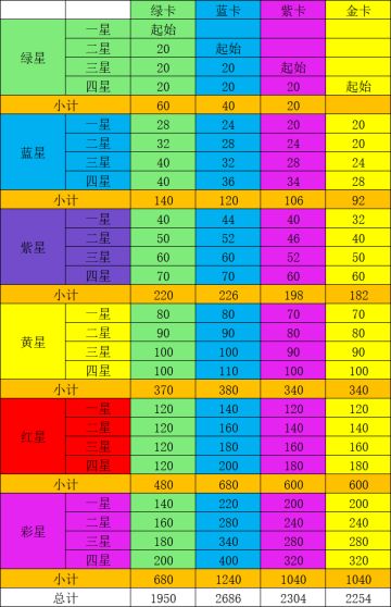 各个颜色佣兵满星的数量表