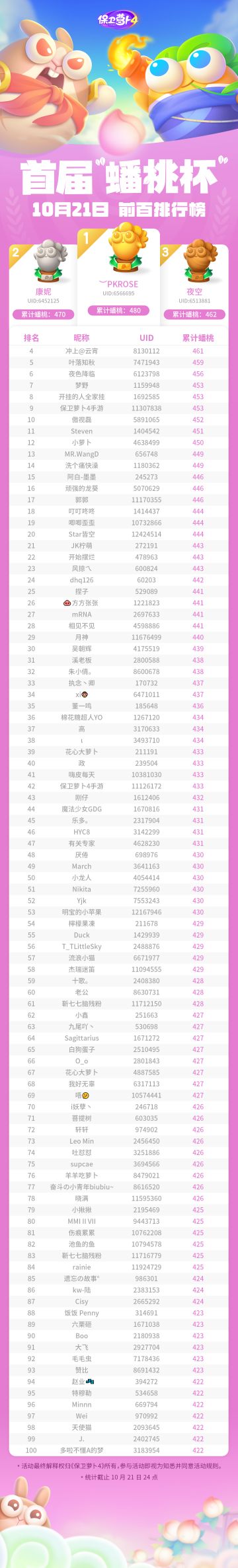 { "text": "《保卫萝卜4》首届蟠桃杯海选赛火热进行中,10月21日周赛成绩 top 100 公布!\n入榜线为422颗蟠桃,小伙伴们加油!\n❀ 温馨提示 ❀\n海选阶段时间:10月17日-10月23日\n最终本周蟠桃总成绩前100的参赛小伙伴将进入下一阶段 ! ", "raw_text": "" }