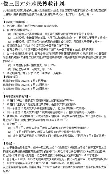 { "text": "《像三国》卡牌竞技手游投稿啦!\n1⃣参与方式:把以《像三国》为主题的视频投稿到🔥🔥B站或抖音🔥🔥\n2⃣有效的投稿视频为:\n(1)自己或他人比赛录像视频,用正常的播放倍数且视频大于等于1分钟\n(2)二创视频,卡牌解说和介绍,甚至可以和其他游戏对比,且视频大于等于1分钟\n(3)吐槽视频,像三国虚心接受来自玩家的吐槽,且视频大于等于1分钟\n⚠投稿视频命名中包含“《像三国》卡牌竞技手游”字样⚠\n【活动时间】\n视频发布时间:2023年1月1日—2023年1月31日\n奖励发放时间:2023年1月1日—2023年2月28日\n⚠更多详细的活动规则请大家查看“像三国对外难民搜救计划图”", "raw_text": "" }