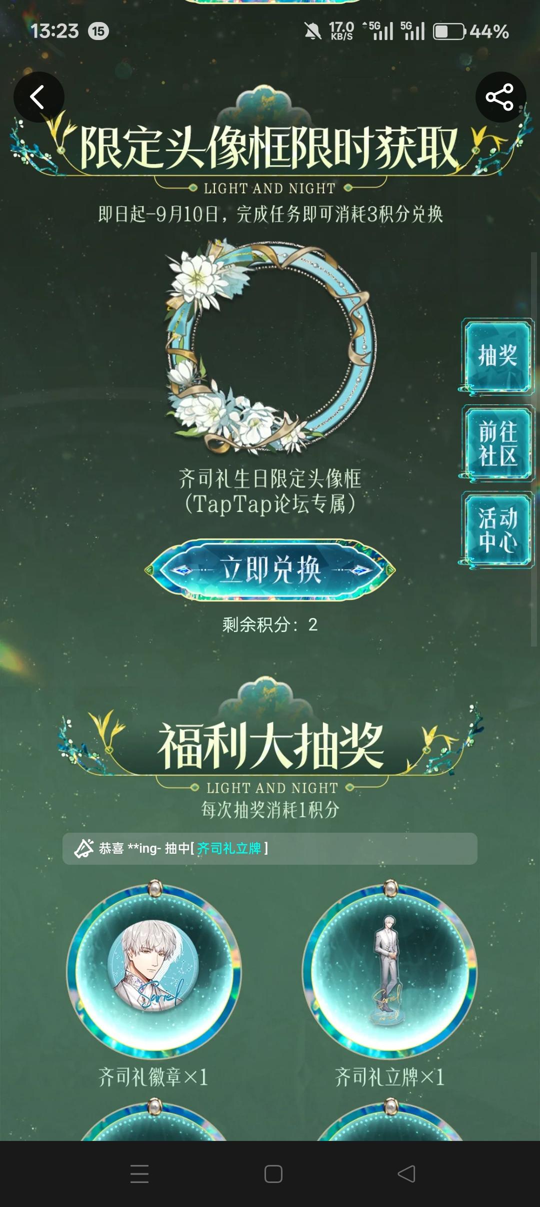 声明:以下所有链接和内容,都来自TAPTAP本站的游戏公司发布,符合《规则百科》,无任何外部链接和内容,请管理员核查。[表情_开心] 领取方式:使用手机,点击下方链接。 活动时限:2025年8月28日—2025年9月10日 领取方式:点击下载链接,完成任务获得积分,使用3积分兑换,获得《光与夜之恋》齐司礼限时头像框。有效时长120天。 同款有效时长可累加,直至永久有效。 来自TapT