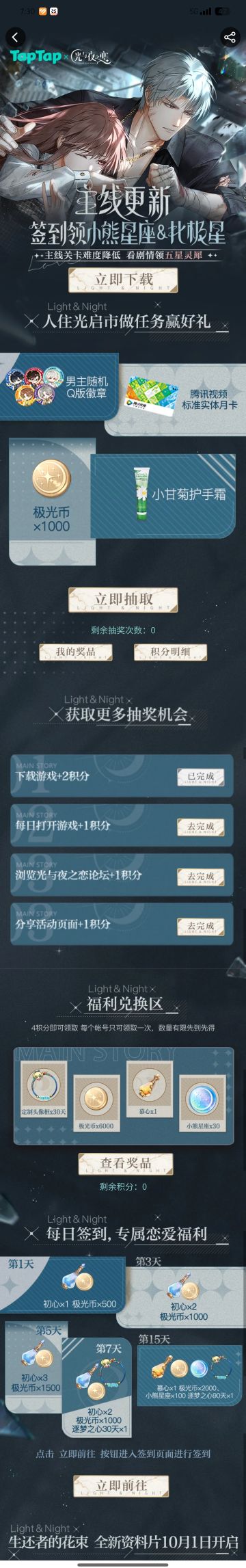 声明:以下所有链接和内容,都来自TAPTAP本站的游戏公司发布,符合《规则百科》,无任何外部链接和内容,请管理员核查。[表情_开心] 领取方式:使用手机,点击下方链接。 活动时限:2025年8月28日—2025年9月10日 领取方式:点击下载链接,完成任务获得积分,使用3积分兑换,获得《光与夜之恋》齐司礼限时头像框。有效时长120天。 同款有效时长可累加,直至永久有效。 活动链接: