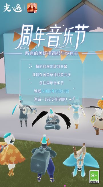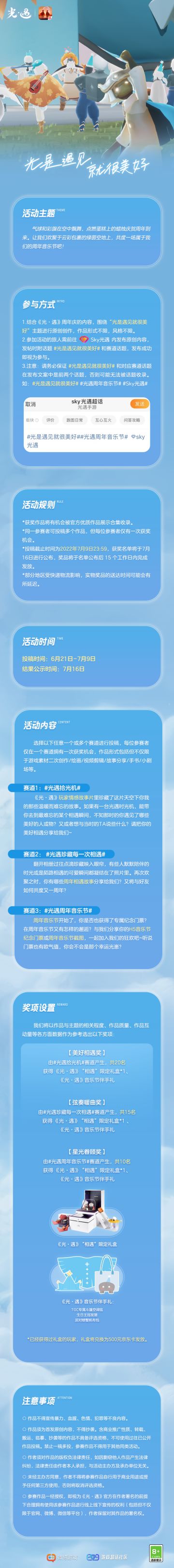 "text": "跟随着音乐节现场的火热气氛\n绿草也在微风中慢摇起舞\n快来领取周年音乐节门票加入我们吧!\n《光·遇》周年庆H5活动正式开启\n6月21日 - 7月9日 24:00\n点击链接:https://sky.163.com/m/anniversary/\n回顾过往领取周年纪念门票的同时\n还有机会抽取“相遇“限定礼盒及线下音乐节门票~\n\n🎁《光·遇》“相遇”限定礼盒🎁\n*每个UID仅有一次抽奖机会,该活动面向光遇玩家,异常账号将不能参与抽奖活动。\n*中奖结果将与UID绑定,请大家妥善保管自己的UID、手机号等个人信息,不要将其泄露给陌生人。\n*请于7月11日~7月17日 期间前往端内,根据预留uid账号收到的邮件指引填写收货信息,逾期未填写则视为放弃领奖资格。\n*奖励将在7月17日地址统计完成后的15个工作日内发放。\n\n🎶《光·遇》线下音乐节门票🎶\n*由于现场承载力有限,我们将从音乐节报名中抽取200位玩家。\n*报名参与线下音乐节的玩家请留意6月24日您所留手机号的短信通知,请及时确认您是否前往线下参与活动。\n🍰\n细细倾听往昔的温暖故事\n与你一同珍藏相遇的美好",