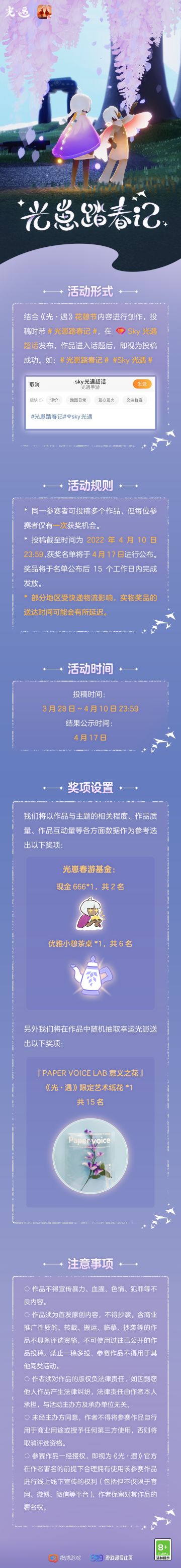 { "text": "花帘烛雨,紫境茶歇\n《光·遇》花憩节活动 将在3月28日正式开启\n💜\n下面小光为大家全面介绍本次活动的细节\n请旅人们点击查看下方长图\n了解更多活动详情\n💐", "raw_text": "" }
