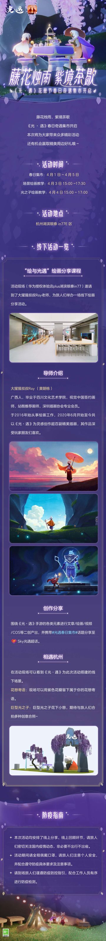 { "text": "春光中点点繁花绽放\n我们在绘画中融注相聚的喜悦\n🌸\n4月1日(周五)~4月5日(周二)\n《光·遇》花憩节春日奇遇集市开启\n旅人们相约线下打卡巨型光之子\n在落紫花树下留下花憩寄语\n地址:杭州湖滨银泰in77E区\n👒\n4月3日 15:00 ~ 17:30、4月4日 15:00 ~ 17:00\n《光·遇》与华为学堂将举办春日绘画活动\n知名画师@大猩猩叔叔Ray 现场授课\n地址:杭州湖滨银泰in77华为授权体验店Plus\n💐\n紫花铺落,闲庭小憩\n让我们在花下共度写生之旅\n一同为春天铺缀温暖的色彩吧!", "raw_text": "" }
