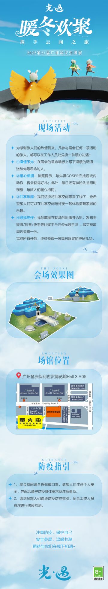{ "text": "云间遨游 冬日暖聚 \n澄澈的池水随风轻漾\n石桥上旅人们相识畅叙\n1月1日(周六)至1月3日(周一)\n我们在广州琶洲保利世贸博览馆Hall 3 A05\n期待与你再续线下聚约\n🛎️\n相聚于冬日的一方绿野\n创造属于我们的暖心回忆\n旅人们在开启云间之旅前\n仔细阅读这份参展指南吧~", "raw_text": "" }