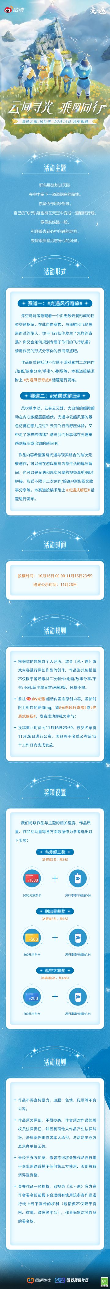 { "text": "群鸟展翅划过天际\n在空中留下一道道烟白的航线\n鲲鸟为伴,穿梭云间\n在风中自由冒险的你收获了怎样的奇遇呢?\n🌬️\n10月16日 00:00~11月16日 23:59\n前往sky光遇超话参与活动~\n带上话题 #光遇风行奇旅# 或 #光遇式解压# \n选择你喜欢的任意形式\n与我们分享你的风中奇遇\n亦或是被风景治愈的瞬间吧~\n🍂 \n在超话内发布你的创意作品 \n即有机会获得京东卡和风行季季节蜡烛\n请旅人们仔细阅读下方长图了解更多活动详情\n期待旅人们分享在风行网道间邂逅的暖心故事~ ", "raw_text": "" }