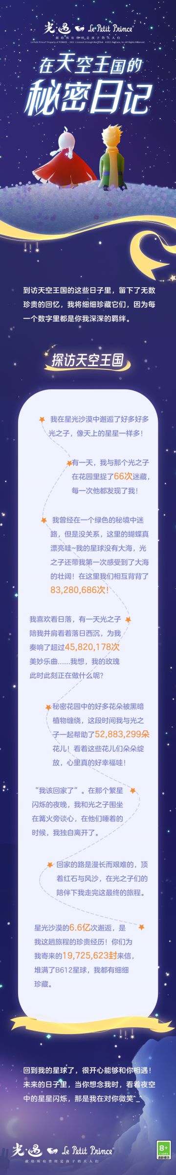 { "text": "繁星见证了我们的相遇和离别\n曾经,小王子向我们诉说心声\n如今,换我们将想说的话记录\n邮寄给小王子或是你所思念的人~\n📷\n10月5日 00:00~10月7日 23:59\n前往星光沙漠,在地图内使用游戏内拍照功能\n即可随机获得明信片或拍立得照片~\n🌹\n10月5日~10月7日\n小王子每日会将小行星夹克魔法*1\n放在遇境商船和魔法工坊\n所有牵手的好友可分享30分钟\n穿着期间,携手好友乘坐飞机\n探索《小王子》世界中的奇妙星球吧~", "raw_text": "" }