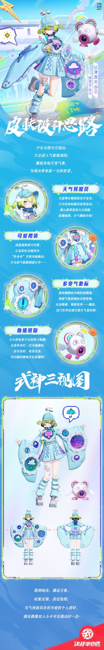 头顶风向标悠然转动, 袖子处图标交替闪烁, 天气预报员将“气象”勘测, 为观众们带来最新的播报。 以津真天新菲利曜系列皮肤「丽槿洞·晴讯」将于11月15日维护后上架服装铺,售价96皮肤券,首周享限时8.8折优惠! 参与活动[曜彩霓光],完成任务即可领取[新菲利曜·专属抵扣券]、[集结·新菲利曜头像礼盒]等珍稀奖励,大人们可别错过啦~ 樱子小贴士:[新菲利曜·专属抵扣券]有效期为11月8日-