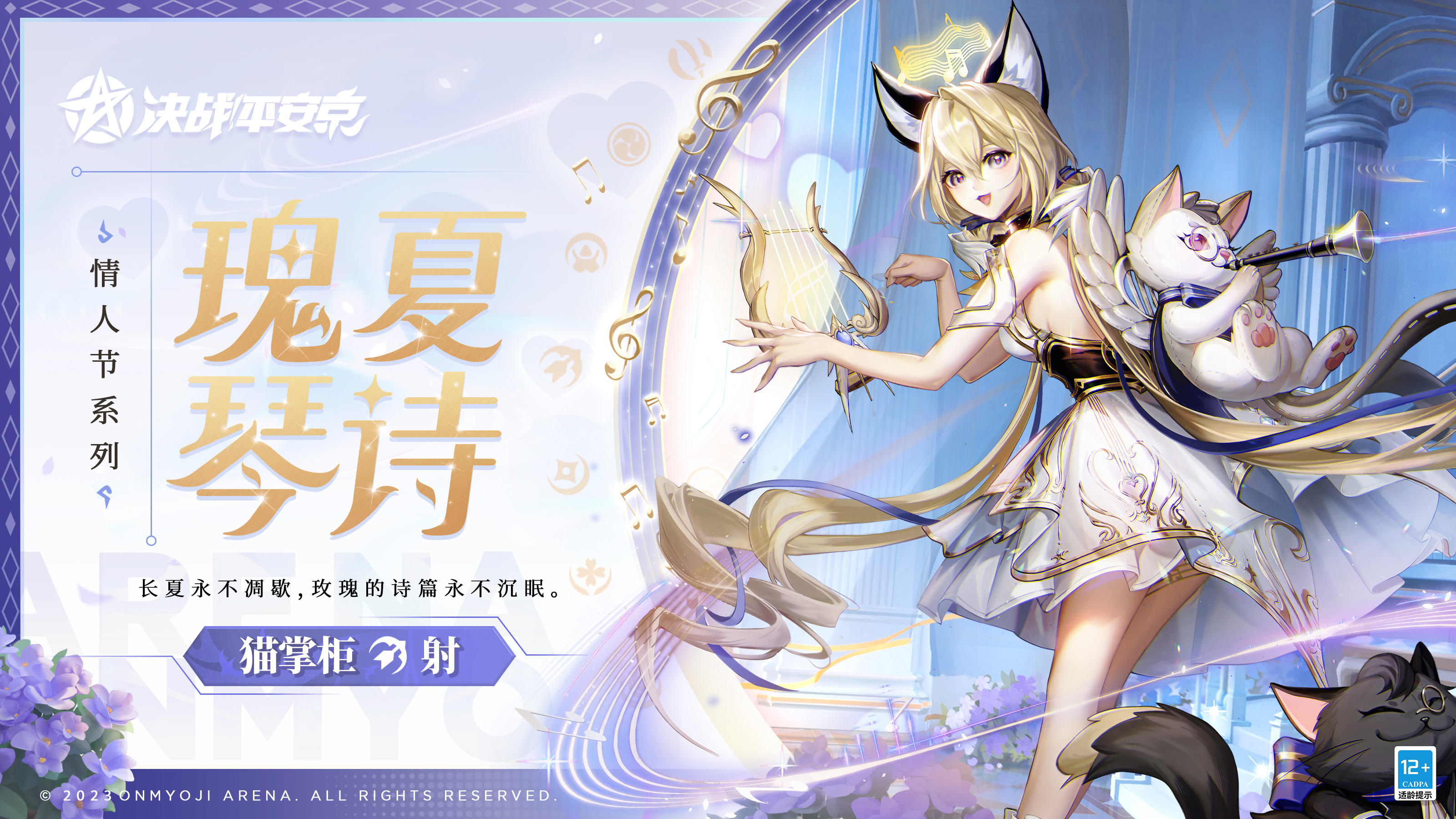 #决战平安京##新皮肤情报# 天琴座的星子化为精灵, 在街头巷尾奏响爱的乐章, 若有幸遇见正弹奏着竖琴的她, 不妨就此献上一首十四行诗, 或是一段浪漫又忠贞的爱情故事, 作为回报,她会为你弹奏一曲动人的乐章~ 2月10日维护后-3月9日,猫掌柜情人节系列限定皮肤「瑰夏琴诗」将限时上架服装铺,局内外语音全新定制,售价96皮肤券,首周享限时8.8折特惠!