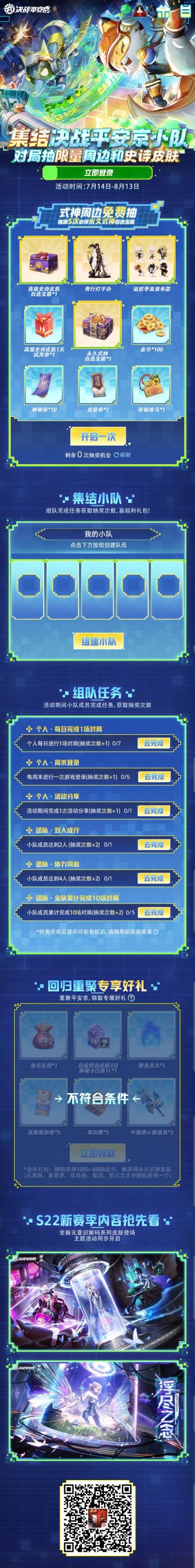 #平安京夏日庆典#☆全新福利活动☆ 夏日悠长,本趟开往夏日庆典的列车的第三站顺利到达!与之一起的,还有S22新赛季全新福利活动!集结小队参与对局即可抽取青行灯手办、返校季盒蛋、高级史诗皮肤自选宝箱等多重好礼!樱子前来为大人们奉上独家指南,一起来看看吧~ ▷活动时间 7月14日-8月13日 ▷活动内容 各位大人通过组成小队,参与对局完成组队任务,即可获得抽奖机会免费抽取青行灯手办、返校季盒蛋(随机款