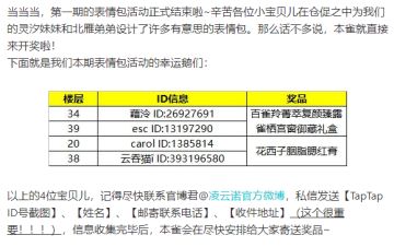 { "text": "emmm,由于一些不可抗力因素,表情包活动的帖子对外被屏蔽了...但是我们奖还是要开的,中奖的小宝贝儿们记得联系官博君【凌云诺手游】,私信发送【TapTap ID号截图】、【姓名】、【邮寄联系电话】、【收件地址】本雀会在尽快安排给大家寄送奖品~\n中奖名单看图哦~", "raw_text": "" }