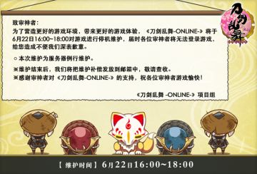{ "text": "【6月22日 全服停机维护公告】\n\n致审神者:\n为提供审神者更稳定的版本活动品质及游戏体验,我们将于6月22日进行全服停机维护更新。期间将无法登录游戏,请审神者留意游戏时间,保管好账号与密码,以避免造成不必要的损失。\n此次停机维护不会影响「秘宝之里~乐器收集~」活动数据,维护结束后,即可正常登录游戏进入活动,我们将通过游戏内邮箱发放补偿物品。\n\n【维护时间】\n6月22日16:00 - 18:00\n\n【维护区服】\n全服\n\n【补偿详情】\n木炭*500、玉钢*500、冷却材*500、砥石*500、小判箱·小*3 \n\n给您带来的不便敬请谅解,感谢审神者一直以来对《刀剑乱舞-ONLINE-》的支持,祝您游戏愉快!", "raw_text": "" }