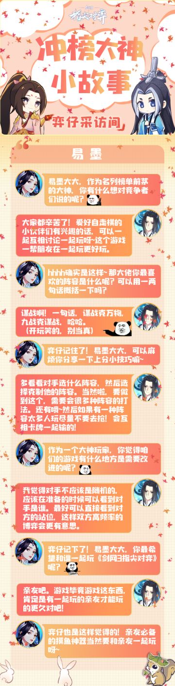 { "text": "【弈仔采访间】他,在江湖中只闻其名,不见其人;他,在冲榜赛中杀出重围稳居前列,却不被众人所识。\n今日,弈仔邀请到了本届全民冲榜赛的摸鱼榜眼,神秘玩家【易墨】做客采访间!\n想了解摸鱼榜眼的上分技巧?想知道大神喜欢什么阵容?快戳下图抢先了解!↓", "raw_text": "" }