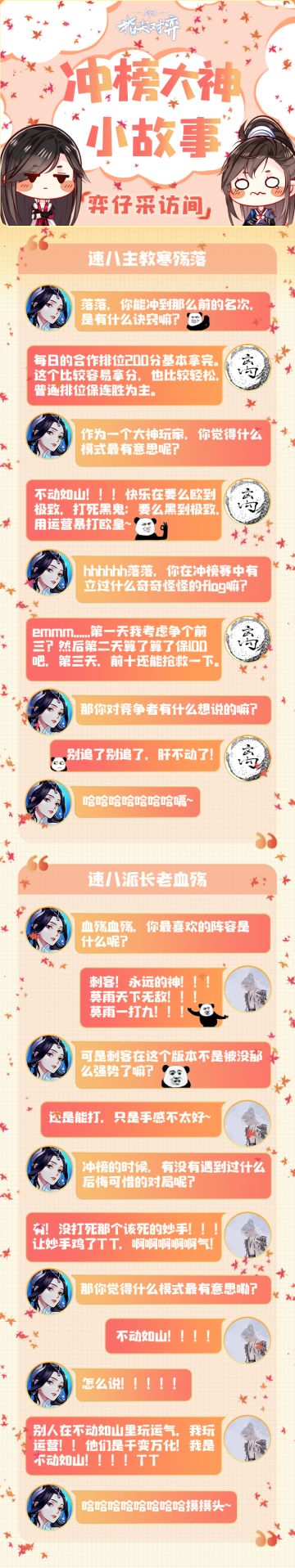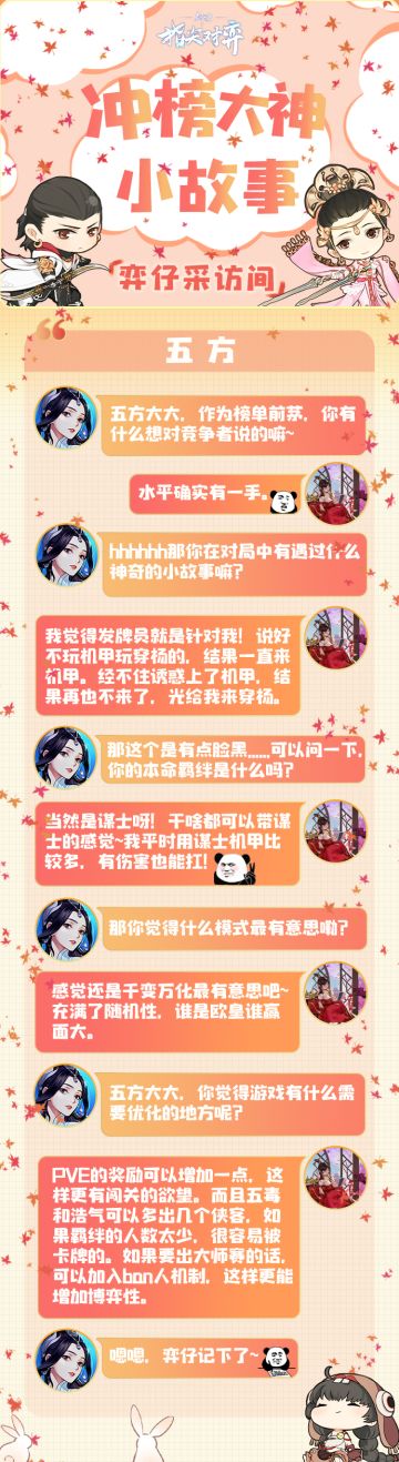 { "text": "【弈仔采访间】他,在激烈的冲榜赛中稳居榜首数日;他,一手谋战打得少有人能出其右;他,在冲榜赛的最后完成了惊天翻转,冲进前三!\n今日,弈仔邀请到了本届全民冲榜赛的第三名摸鱼探花,【韩非】做客采访间!\n想了解大神对弈的乐趣?想知道他留给萌新玩家的小建议?快戳下图抢先了解!↓", "raw_text": "" }