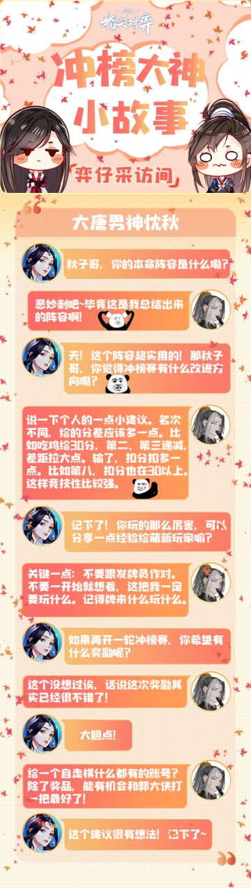 { "text": "【弈仔采访间】他,才思敏捷,长于变阵;他,善于阵容推演,开创了实用性极强的流派【恶妙刺】!\n今日,弈仔邀请到了《剑网3指尖对弈》的大神玩家【大唐男神忱秋】做客采访间!\n想了解他给萌新侠士的小建议?想知道他有什么新想法?快戳下图抢先了解!↓", "raw_text": "" }