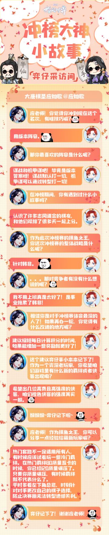 { "text": "【弈仔采访间】他,在激烈的冲榜赛中稳居榜首数日;他,一手谋战打得少有人能出其右;他,在冲榜赛的最后完成了惊天翻转,冲进前三!\n今日,弈仔邀请到了本届全民冲榜赛的第三名摸鱼探花,【韩非】做客采访间!\n想了解大神对弈的乐趣?想知道他留给萌新玩家的小建议?快戳下图抢先了解!↓", "raw_text": "" }