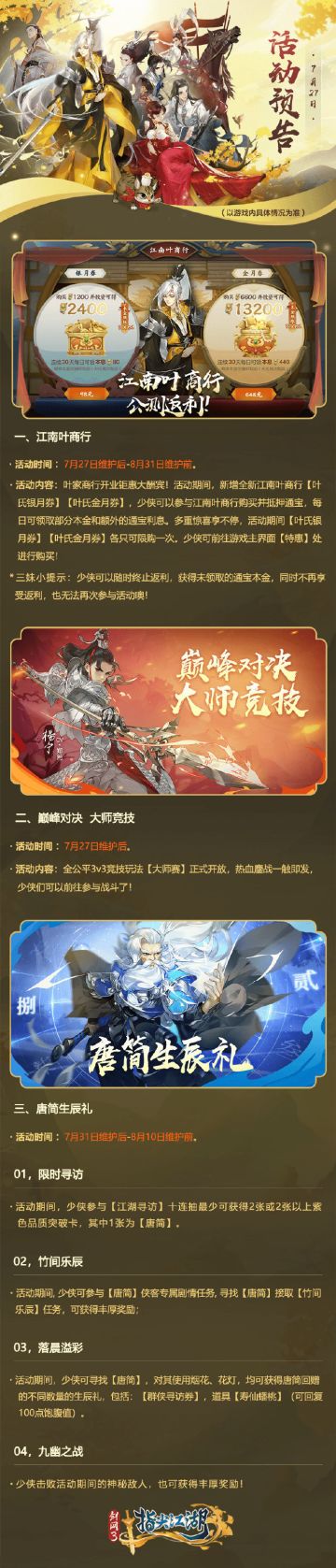 { "text": "近期活动抢先看!\n7月27日维护后,【江南叶商行】将上线!少侠可前往游戏主界面【特惠】处查看详情~同时【大师赛】玩法也将同步开启!\n7月31日维护后,唐简生辰礼活动开始,大家记得前往稻香村为唐简贺寿噢~!", "raw_text": "" }