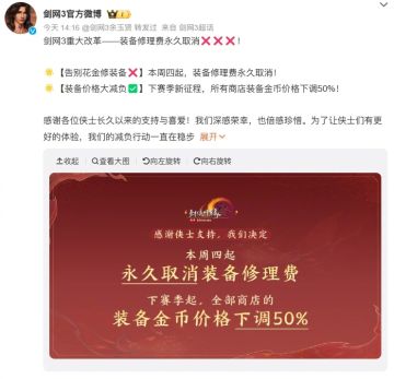 剑网3永久取消装备修理费!
