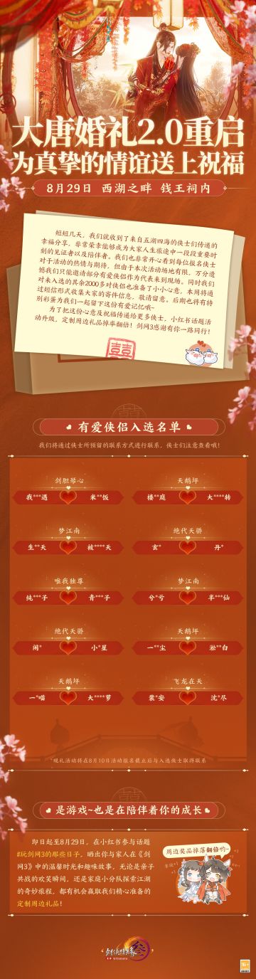 《剑网3》大唐婚礼2.0有爱侠侣入选公示