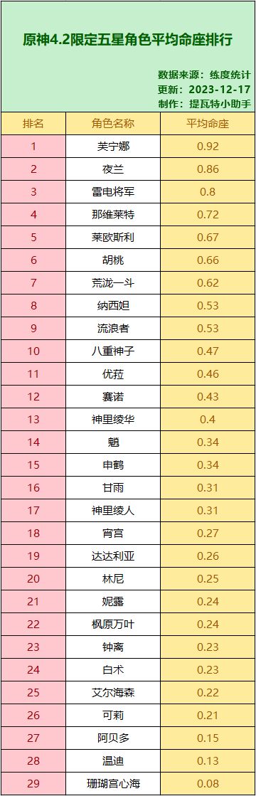 原神4.2限五角色平均命座排行,芙宁娜、夜兰、雷神命座最高!