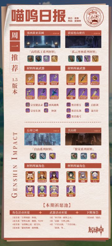 【1.5版本喵呜日报】全武器全角色每日材料刷新推荐。