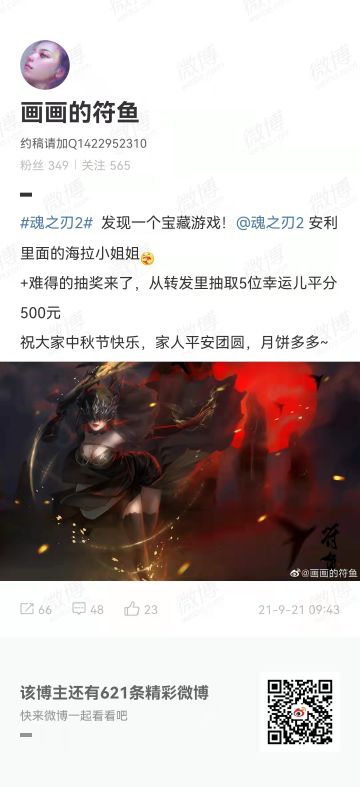 "text": "早上有同事微博摸鱼发现了一位宝藏画手,为《魂之刃2》创作了海拉同人作品一份。这么棒的作品怎能不分享给各位大大一起围观呢~~~\nPS:宝藏小姐姐的这篇博文在做转发抽奖活动哦,活动结束时间到10月3日。想拼一拼运气的大大快去转发吧~\n\n活动微博指路:https://m.weibo.cn/3919320437/4683800846010586\n魂之刃2官方微博:https://weibo.com/p/1006067600192849",