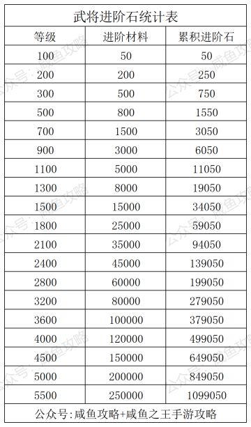 【咸鱼之王】新版本武将进阶石统计表