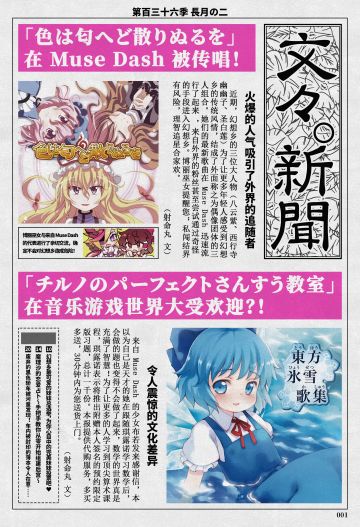 { "text": "「Muse Dash × 东方Project」联动特别版文文新闻,绝赞公开中!\n本期为大家介绍两首在 Muse Dash 收录的幻想乡本地歌曲:\n「色は匂へど散りぬるを」、「チルノのパーフェクトさんすう教室」\n\n在这背后还有关于结成偶像组合的三人和收到布若感谢信的琪露诺的故事?\n想要把握流行风向,成为话题中心的各位千万不要错过!\n等等……应该不止这些吧?\n没错,更多有关两界交流的情报还请期待下期 (´>ω∂`)☆\n以上,来自联动特派记者·幻想乡最速的射命丸文!\n", "raw_text": "" }