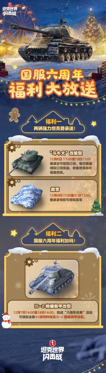 车长,你有一份六周年福利指南待领取! “斗牛犬”改装型、霜雪、IS-2“格栅”共三辆战车奖励 今日起,参与游戏内活动既有机会获得! WOTB六周年,感恩各位车长的支持厚爱,2024也继续一起作战啦! 快上号,咱们游戏里见! #坦克世界闪击战##WOTB#